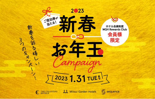 株式会社三井不動産ホテルマネジメント(所在地:東京都中央区)は、三井不動産グループの国内外39ホテルを対象とした会員プログラムMGH Rewards Clubの会員様を対象に、「新春お年玉キャンペーン」を2023年1月31日(火)まで実施いたします。