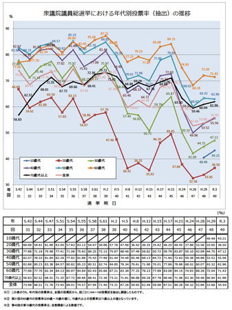 出典:総務省 国政選挙における年代別投票率:https://www.soumu.go.jp/senkyo/senkyo_s/news/sonota/nendaibetu/