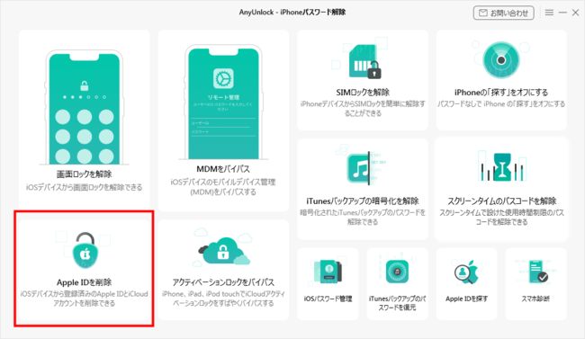 2、USBケーブルでデバイスをパソコンに接続して、「Apple IDを解除」を選択します。Apple IDロックが掛かっていない場合、「画面ロックを解除」機能を選択してください。どの機能を使用すればよいかわからない場合は、サポート チームにお問い合わせください。