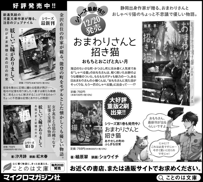 静岡県&石川県が舞台のことのは文庫シリーズ『おまわりさんと招き猫』『妖しいご縁がありまして』を中日新聞・北陸中日新聞・東京新聞に掲載いたしました