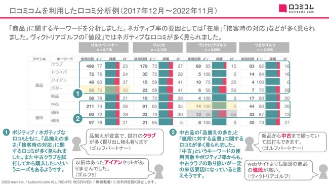 商品の説明やゴルフクラブを購入する際の「アドバイス」といったキーワードがポジティブ率の高いキーワードとしてランクインしています。ネガティブな口コミとしては、ゴルフクラブや関連商品の在庫不足に関するキーワードが多く寄せられていました。
