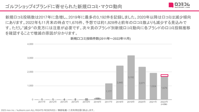 新規口コミ投稿数は2017年に急増し、2019年に最多の3,192件を記録しました。2020年以降は口コミは減少傾向にあります。2022年も11月末の時点で1,676件、予想では約1,828件と前年の口コミ数よりも減少する見込みです。ただし”減少”の見方には注意が必要です。この口コミ減少は、特定のブランドの急激な増減に影響されています。