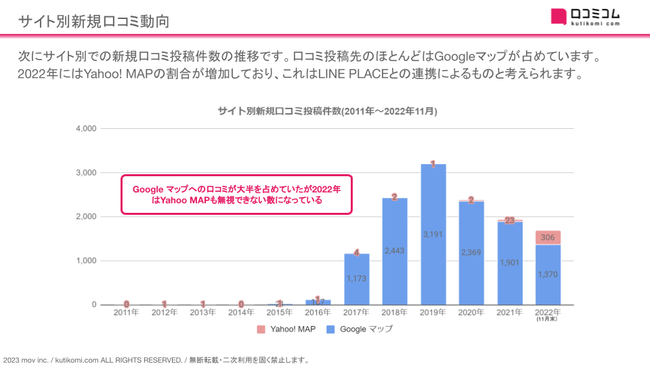 次にサイト別での新規口コミ投稿件数の推移です。口コミ投稿先のほとんどはGoogleマップが占めています。2022年にはYahoo! MAPの割合が増加しており、これはLINE PLACEとの連携によるものと考えられます。