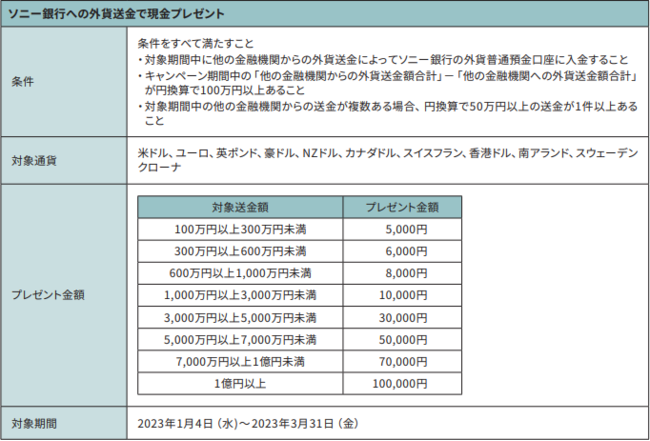ソニー銀行株式会社(代表取締役社長:南 啓二/本社:東京都千代田区/以下 ソニー銀行)は、2023年1月4日(水)より、3つのキャンペーンを実施しますのでお知らせいたします。