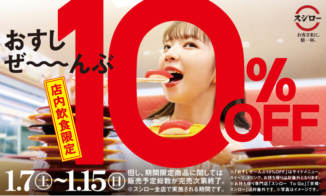 株式会社あきんどスシロー(本社:大阪府吹田市、代表取締役社長:新居 耕平)は、1月7日(土)より、店内飲食限定でおすし全商品が税込価格より10%OFFとなる『おすしぜ~んぶ10%OFF』(※1)を行います。新しい年の始まりに合わせてお客さまへの感謝の気持ちを込めた大還元フェアです。