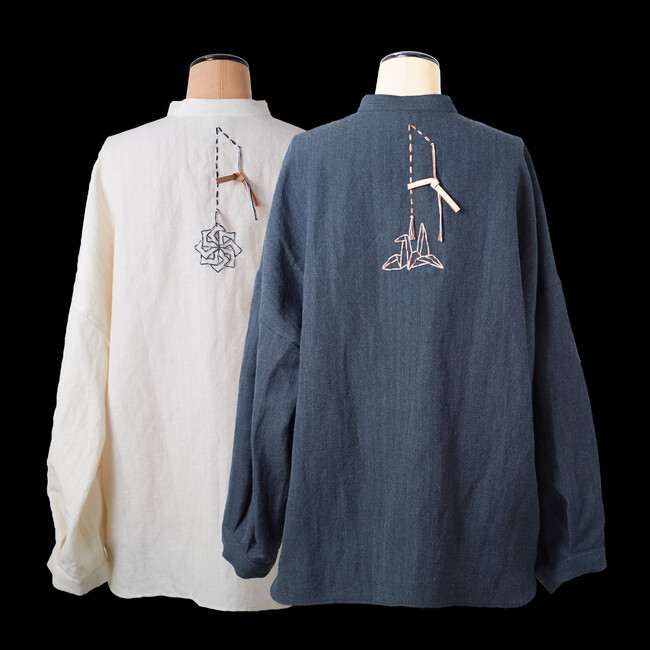 こどもの魔除けとして着物に刺繍されてきた「背守り」を昇華したシャツには、吉祥の鶴、松、風車の柄紋を