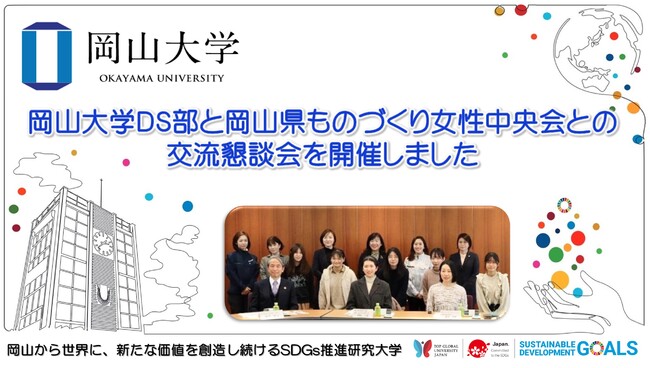 国立大学法人岡山大学(本部:岡山市北区、学長:槇野博史)は、2022年12月23日、学生サークル・岡山大学DS(データサイエンス)部と岡山県ものづくり女性中央会との交流懇談会を本学津島キャンパスの本部棟で開催しました。