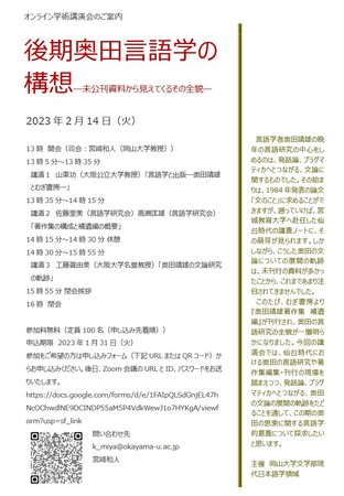 【岡山大学】文学部 現代日本語学領域学術講演会「後期奥田言語学の構想-未公刊資料から見えてくるその全貌-」(2/14火, オンライン開催)