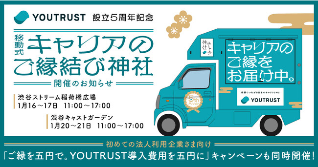 【YOUTRUST 5周年特別企画】移動式「キャリアのご縁結び神社」が登場!~5年間のご縁に感謝!法人利用が初めての企業さま向け特別キャンペーンも実施~