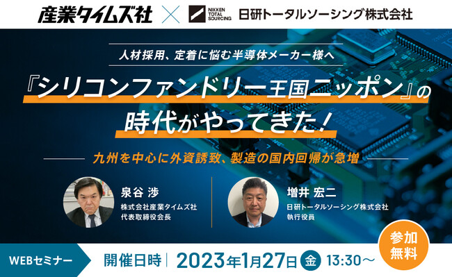 1月27日、新聞、雑誌、書籍などの編集・制作・販売している株式会社産業タイムズ社(東京都千代田区)と半導体に特化した自社研修施設を保有し、全国的に保全人材ソリューションを提供している日研トータルソーシング株式会社(本社:東京都大田区)は、共催で企業向けハイブリッドセミナーを開催いたします。