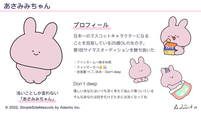 TikTokで注目を集めている大人気うさぎキャラクター「あさみみちゃん」(※)は、キャラクタータレント事務所「Simple Side Mascots(サイマス)」所属のキャラクターです。深く考えてしまいがちな世の中で、あなたのそばに寄り添う、あなたの気持ちを浅くする寄り添いうさぎで、2022年12月、TikTokアカウントのフォロワー数は370万人を突破し、只今人気急上昇中の注目キャラクターです。
