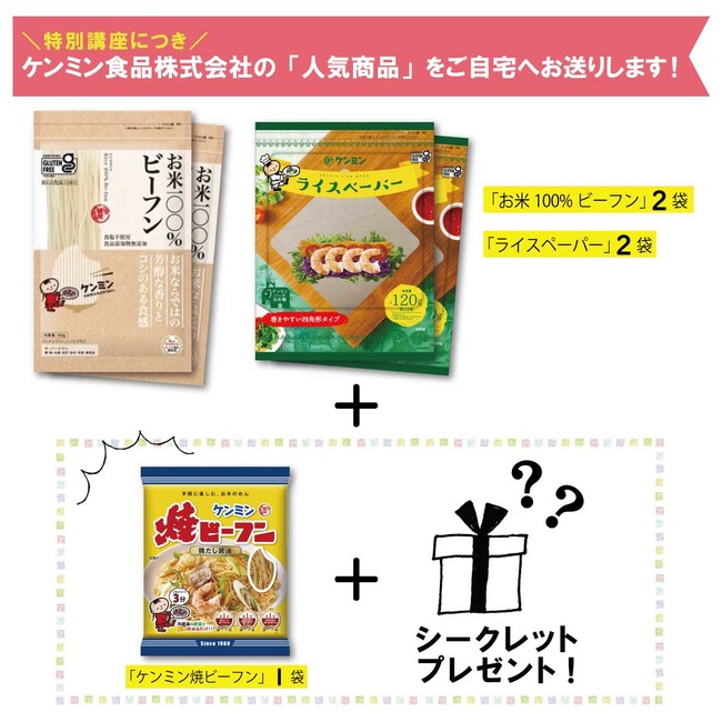 今回は、「ケンミン食品株式会社」の焼ビーフンやライスペーパーなどを使った特別料理講習会を、対面とオンラインとで開催します。