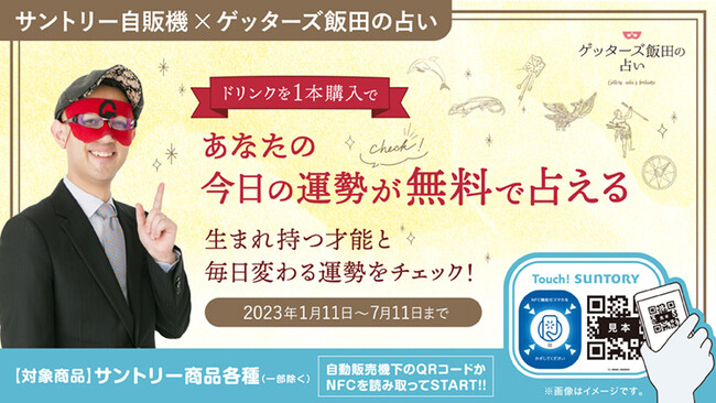 「ゲッターズ飯田の占い」が期間限定でサントリー自販機「Touch!SUNTORY」に登場!ドリンク1本購入で今日の運勢が無料で占えるキャンペーン開催