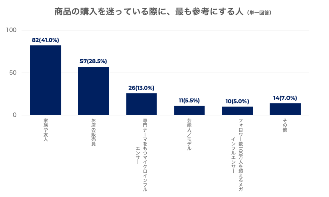 「家族・友人」41%、「お店の販売員」28.5%と、芸能人やインフルエンサーを大きく引き離す結果となりました。