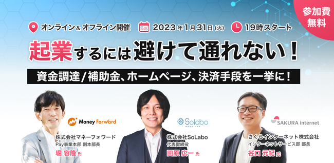株式会社SoLabo(東京都千代田区、代表取締役:田原広一、以下SoLabo)は、株式会社マネーフォワード(東京都港区、代表取締役社長CEO:辻庸介)、さくらインターネット株式会社(本社:大阪府大阪市、代表取締役社長;田中邦裕)と共催し「起業するには避けて通れない!資金調達/補助金、ホームページ、決済手段を一挙に!」をテーマとしたオフライン/オンライン同時開催セミナーを開催いたします。オフライン会場ではセミナー後に交流会も開催予定です。