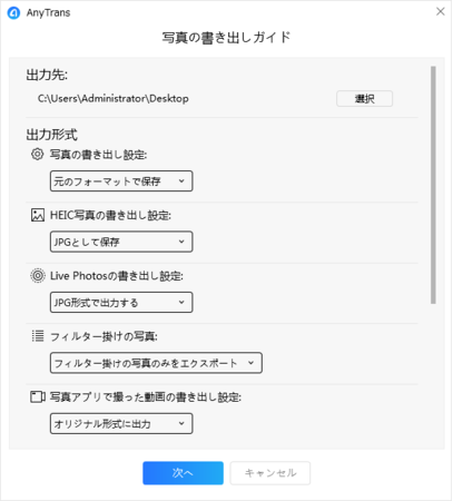 Step 5: 表示された「写真の書き出しガイド」項目で出力先や出力形式を設定して「次へ」をクリックします。