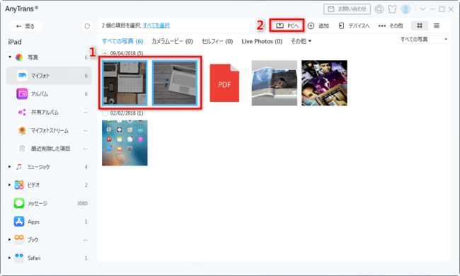 Step 3: パソコンに入れたい写真を選択して右上の「PCへ」ボタンを選択します。