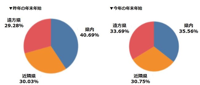 2021年に比べると、2022年は「県内」に遊びに行った人の割合が40.69%から35.56%と減っており、「遠方県」へ遊びに行った人は29.28%から33.69%と増えています。昨年の年末年始に比べ、今年の年末年始は遠出をした人が多くなっていることが分かります。
