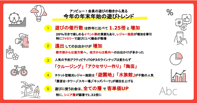 【アソビュー!年末年始の販売実績を発表】行動制限のない3年ぶりの年末年始の遊びトレンド!遊んだ数は昨年比1.25倍に増加。都市部からは遠方へ、地方は地元で遊ぶ冬に。お出かけ先はレジャー施設が1番人気