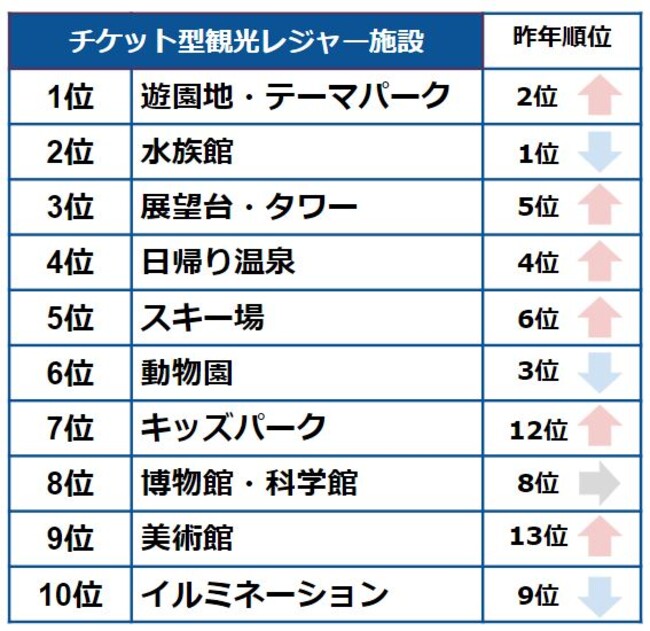 昨年のランキングでは5位だった「展望台・タワー」が順位を2つ上げて3位、「スキー場」が順位を1つ上げて5位、昨年は10位圏外だった「キッズパーク」が7位にランクインしています。一方、昨年3位だった「動物園」は順位を3つ落として6位、昨年7位の「ロープウェイ・ケーブルカー」や10位の「フラワーパーク・植物園」も今年のランキングでは10位圏外となっています。