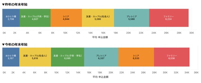 どの層でも客単価が増加しており、特に「シニア」が最も顕著で4,944円から6,533円と1,589円の増加、「友達・カップル(子供・学生)」は4,927円から6,095円と1,168円の客単価上昇が見られました。