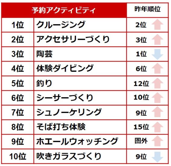 予約アクティビティのジャンルでは、昨年2位だった「クルージング」が1位に、3位だった「アクセサリー作り」が2位に、1位だった「陶芸」が3位と、TOP3のラインナップはそのまま変わらず、順位が入れ替わる結果となりました。