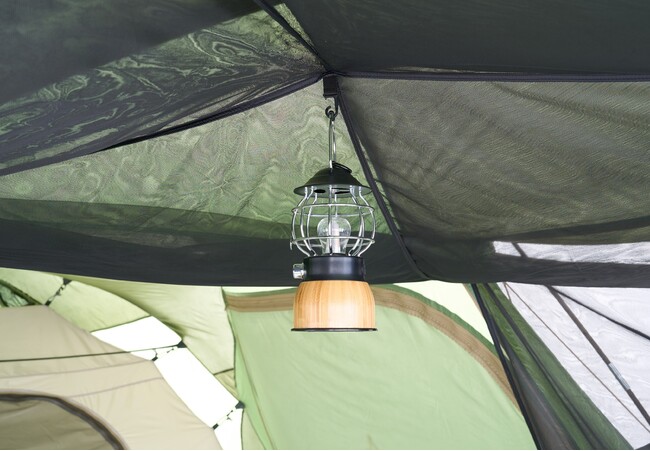 取り外しが簡単な吊り下げ式で、対応するテントのPANEL SYSTEM部分にあるフックや本体のジッパーに取り付け、下部をペグダウンすれば装着できます。天井部分にはフックを装備しているので、ランタンの吊り下げも可能です。