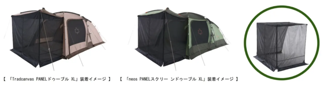 「neos PANELスクリーンドゥーブル XL」、「Tradcanvas PANELドゥーブル XL」などの対応するテントに取り付けると広々とした3ルームに早変わりします。