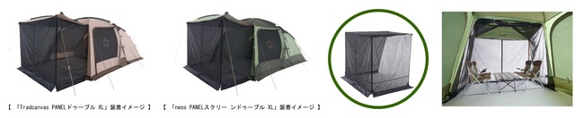 「neos PANELスクリーンドゥーブル XL」「Tradcanvas PANELドゥーブル XL」など、対応する別売りのテントに取り付けるとリビングスペースが拡張し、広々とした3ルームが実現。