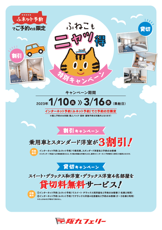 関西と九州を結ぶ阪九フェリーでは、インターネット予約(ふネット予約)のお客様限定に特別キャンペーン(3割引・貸切料無料)を2023年1月10日(火)より実施しております。