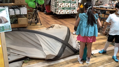 人気の空気でふくらむふしぎなテント「エアマジックドーム」の設営体験ができるタイムアタックを開催。親子でトライでき、キャンプ初心者の方でも気軽に楽しめる!