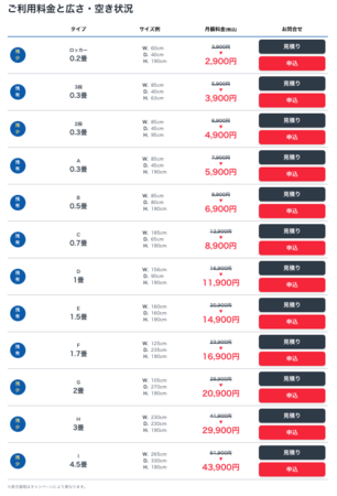 部屋タイプとサイズ、月額料金はこちら