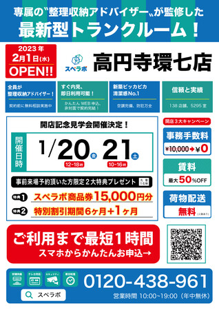 オープンに合わせ1月20日(金)21日(土)に見学会を実施しますので、ぜひ【スペラボ・高円寺環七店】にお越しくださいませ。