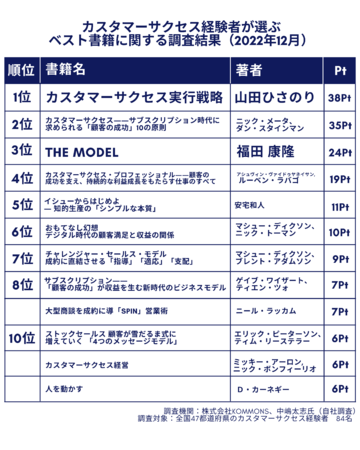 第1位は、『カスタマーサクセス実行戦略(著: 山田ひさのり)』。第2位は『カスタマーサクセス――サブスクリプション時代に求められる「顧客の成功」10の原則(著:ニック・メータ)』、第3位は『THE MODEL(著:福田 康隆)』がランクイン