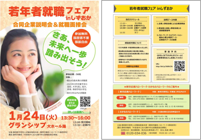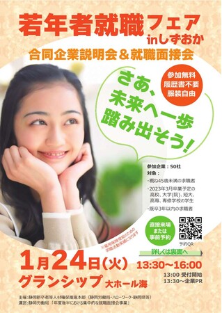 静岡新卒者等人材確保推進本部(静岡労働局、ハローワーク、静岡県等)は、概ね45歳未満の方、2023年3月卒業予定の学生(高校生・大学生等)及び既卒3年以内の方を対象とした合同企業説明会&就職面接会を令和5年1月24日にグランシップ(静岡県静岡市)で開催します。