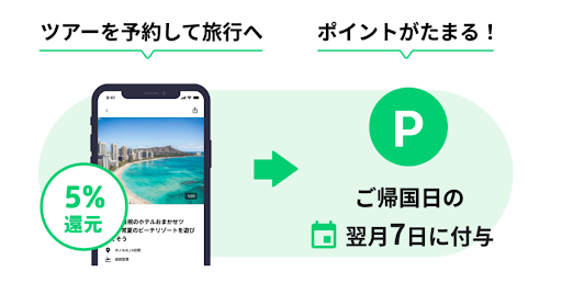 NEWTで予約したツアーの「旅行代金の5%分」のポイントがたまります。ツアー帰国日の翌月7日がポイント付与日です。付与予定のポイントは、ツアーの予約画面やマイページで確認できます。
