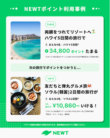 今回は、スタートを記念し、ポイント付与の対象を、今後の予約のみならず過去のご旅行分も対象としました。『NEWT』は、より多くの方に、繰り返し旅行を楽しんでいただければと考えています。1ポイント=1円として次回の旅行予約で使えるポイントの付与を通して、これからも「かんたん・おトク」な海外旅行をみなさまに提供いたします。