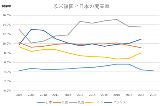 中小企業庁によると、日本の開業率は2008年~2018年にかけて4~5%前後となっており、欧米諸国と比較し、一貫して低い水準で推移しています。
