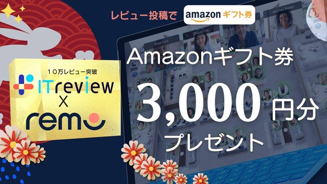 B2B IT製品レビューサイト「ITreview(ITレビュー)」で、オンラインイベント・仮想オフィスツール「Remo(リモ)」のユーザーレビューを投稿すると、先着10人にAmazonギフト券3,000円がプレゼントされる、期間限定のお年玉キャンペーンが実施されています。