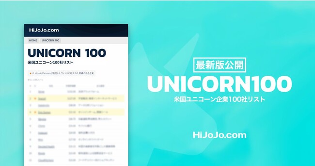 非上場スタートアップ投資プラットフォームのHiJoJo Partners株式会社(本社:東京都港区、代表取締役:スピリドン・メンザス、以下HiJoJo Partners)は、米国に本拠を置くユニコーン企業(*1)を企業評価額順に100社リストアップした米国ユニコーン企業100社リスト「UNICORN100」の最新版をHiJoJo Partnersの投資家向け情報サイト「HiJoJo.com(https://www.hijojo.com/)」で公開しました。