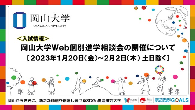 国立大学法人岡山大学(本部:岡山市北区、学長:槇野博史)は、本学に一般選抜での出願を検討している受験生を対象に「出願直前個別進学相談会」を、2023年1月20日(金)~2月2日(木)〔土日除く〕にWeb(Zoom)で実施します。