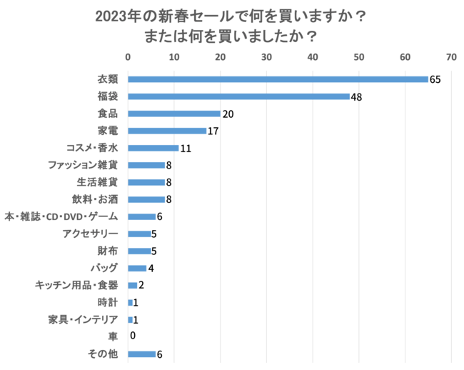 「2023年の新春セールで何を買いますか?または何を買いましたか?」という質問に対して、「衣類」が65票を集め、「福袋」48票、「食品」20票と続く結果になりました。