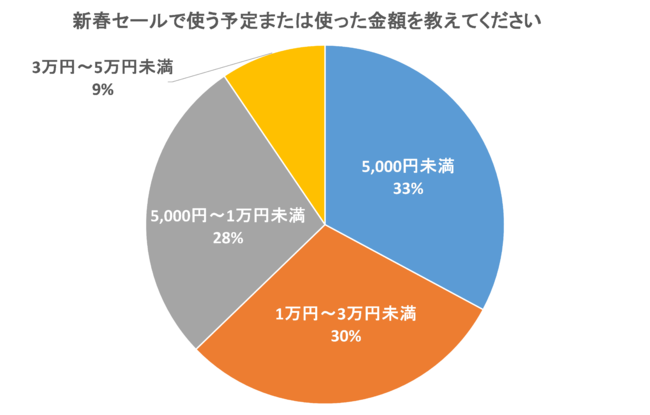 「新春セールで使う予定または使った金額を教えてください」という質問では、「5,000円未満」「1万円~3万円未満」「5,000円~1万円未満」が拮抗する結果になりました。