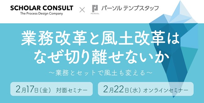 総合人材サービスのパーソルグループで人材派遣・アウトソーシング事業を手掛けるパーソルテンプスタッフ株式会社(本社: 東京都渋谷区、代表取締役社長: 木村 和成、以下パーソルテンプスタッフ)は、日本企業に向けた組織風土改革のパイオニアである株式会社スコラ・コンサルト(本社: 東京都品川区、代表者: 簑原 麻穂、以下スコラ・コンサルト)と共催で「業務改革と風土改革はなぜ切り離せないか~業務とセットで風土も変える~」をテーマに、2月17日(金)に対面で、2月22日(水)にオンラインでセミナーを開催します。