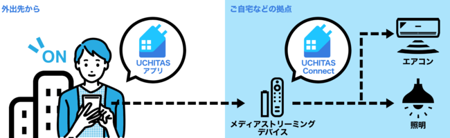 本機能は、「UCHITAS」と新たにリリースするメディアストリーミングデバイス※2に対応したコンパニオンアプリ※3「UCHITAS Connect(ウチタス コネクト)」を連携させて実現します。これにより、外出中や旅行先で、お手元のスマホを使用して機器状態の確認やリモコン操作ができるようになります。対象のメディアストリーミングデバイスをすでにお持ちの場合は、新たな接続機器の購入、設置工事も不要です。