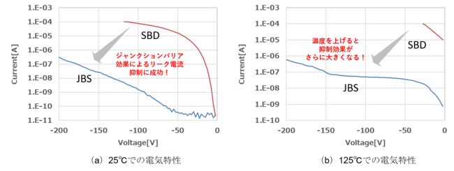 その後、作製したJBS構造チップに逆方向電圧を印加し、酸化イリジウムガリウムの埋込構造によるリーク電流の抑制効果を確認しました(比較対象には、同一ウエハ内に作製したSBDを使用)。また、温度を25℃から125℃に上げたとき、さらに抑制効果は大きくなることを確認しました。