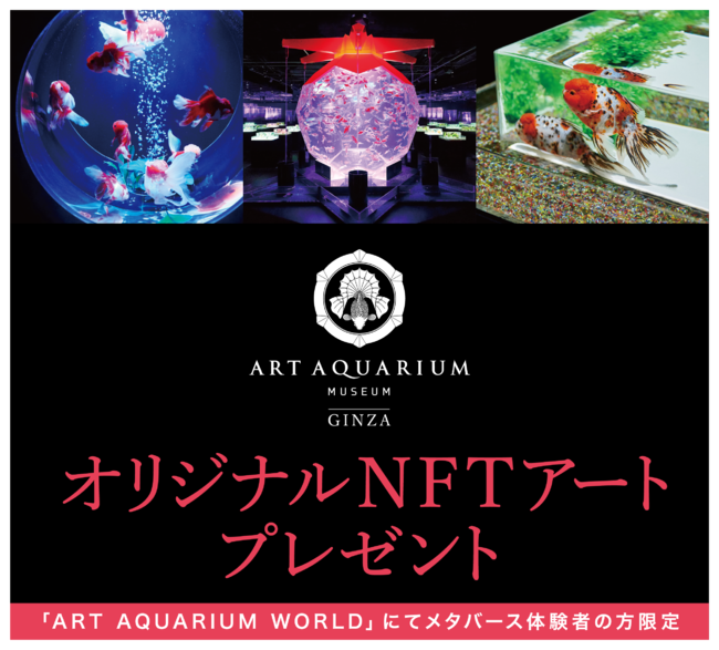 方法:「ART AQUARIUM WORLD」にてメタバース体験後アンケートにご回答いただいた方にオリジナルNFTアートをプレゼント(限定150名様。無くなり次第終了となります。但し、メタバース体験は2023年3月31日まで実施予定※期間を延長しました)。