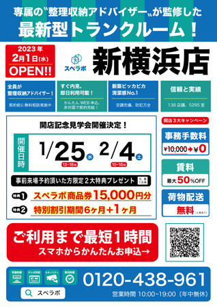 【新横浜店/2月1日(水)オープン】見学から契約、解約まで完全非接触・非対面、お申し込みからご利用まで最短1時間!都内、大阪などにて絶賛運営中のトランクルーム【スペラボ】が新横浜駅近くに出店!