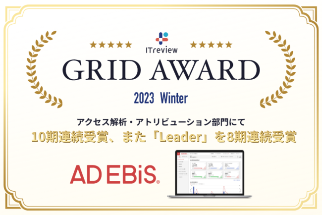 アドエビス、「ITreview Grid Award 2023 Winter」のアクセス解析・アトリビューション部門でユーザーの満足度・認知度の双方が優れた製品に贈られる「Leader」を8期連続受賞