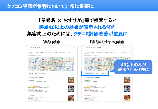 中でも、Googleマップはクチコミが集まりやすい媒体として注目を集めており、Googleマップのクチコミを参考にしながら来店するお店を決めるユーザーが急増しています。